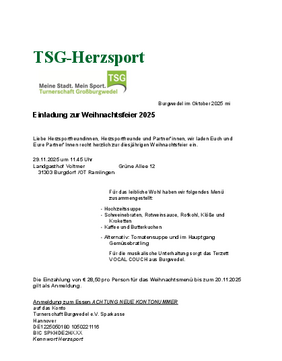 Die Einzahlung von € 28,50 pro Person für das Weihnachtsmenü bis zum 20.11.2025 gilt als Anmeldung. Anmeldung zum Essen ACHTUNG NEUE KONTONUMMER auf das Konto Turnerschaft Burgwedel e.V. Sparkasse Hannover DE1225050180 1050221116 BIC SPKHDE2HXXX Kennwort: Herzsport