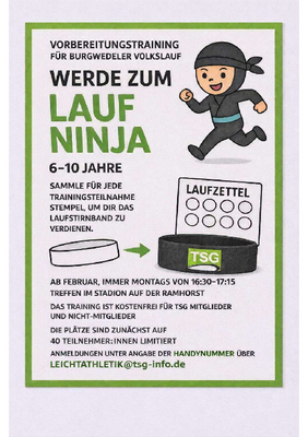 Für den Burgwedeler Volkslauf am 25.04.2026 bietet die Leichtathletikabteilung der TSG ein kostenloses Vorbereitungsangebot für Kinder im Alter von sechs bis zehn Jahren an. In Kooperation mit den Grundschulen können auch Kinder teilnehmen, die kein Mitglied in der TSG sind.